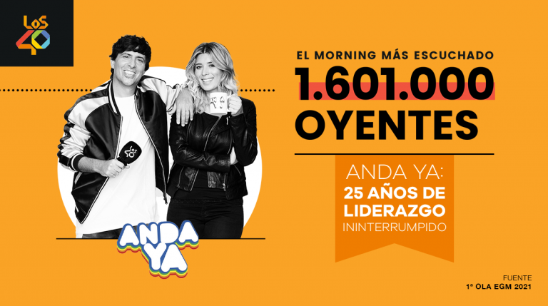 En LOS40 lideramos la radio musical en España con 2.792.000 oyentes de lunes a viernes, casi 1.200.000 oyentes más que el segundo en los rankings, Cadena 100. Nuestro programa despertador, Anda Ya! con Dani Moreno y Cristina Boscá, es el que más ha crecido, suma 1.601.000 oyentes y cumple 25 años de liderazgo ininterrumpido de las mañanas musicales.