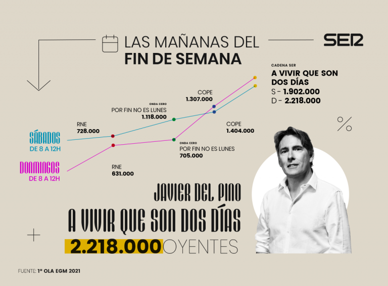 En las mañanas del fin de semana, A vivir que son dos días, con Javier del Pino, vuelve a subir los sábados hasta 2.218.000 oyentes alcanzando en este día el mejor resultado en los últimos 5 años, y los domingos lidera con 1.902.000.
