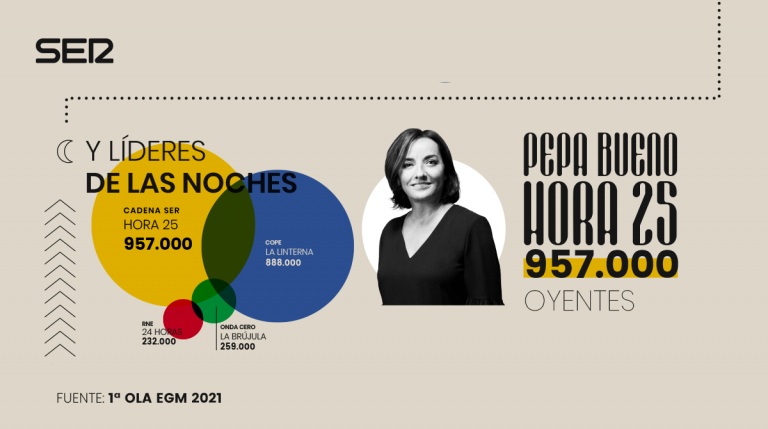 Hora 25, dirigido por Pepa Bueno, lidera ampliamente los informativos nocturnos con 957.000 oyentes cada noche.