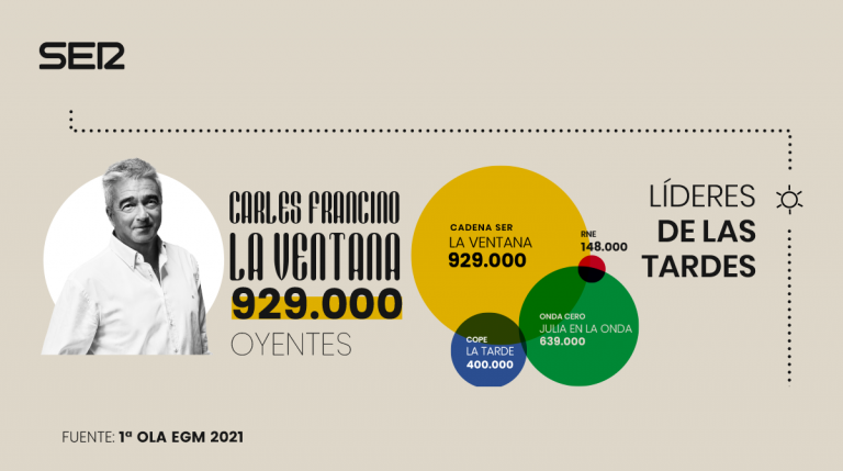La SER también es la cadena preferida en los programas radiofónicos de la tarde. La Ventana, de Carles Francino, alcanza su mejor resultado en cinco años; logra 92.000 oyentes más que en la pasada ola, consiguiendo cada día 929.000 oyentes.