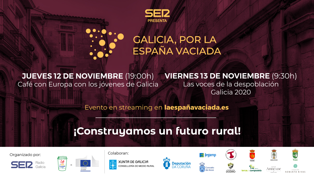 Los próximos foros de la Cadena SER por la España Vaciada ya tienen fecha. Tras su reciente paso por Aragón, los foros se celebrarán el 12 y 13 de noviembre en Galicia, y el 19 y 20 de noviembre en Lorca (Murcia) tanto de forma presencial como vía streaming. En todos ellos contaremos con la colaboración de la Comisión Europea en la organización del encuentro con jóvenes ‘Café con Europa‘ de forma virtual. Además, los foros dispondrán de todas las medidas de seguridad establecidas a causa de la pandemia. Infórmate aquí de los nuevos foros que se van incorporando al calendario.