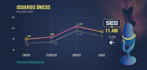 La Cadena SER mantiene su liderazgo en audiencia digital registrando 11.477.000 usuarios únicos durante el mes de abril, superando así otro mes más los 10 millones de u.u. Respecto a abril de 2019, la Cadena SER incrementa casi un 50% su audiencia digital.