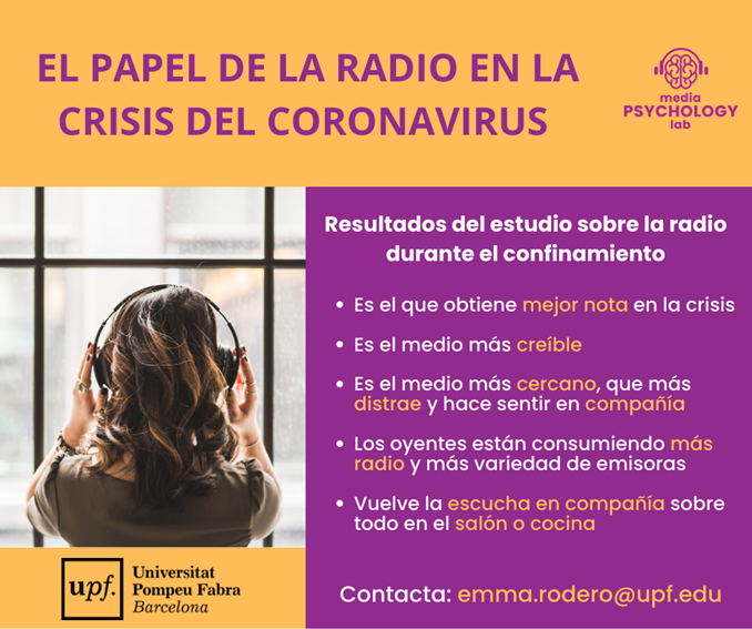 Durante la situación excepcional que vivimos provocada por la COVID-19, la radio vuelve a tener un papel protagonista entre aquellos que la siguen de manera fiel. Así lo muestra un estudio realizado por el Media Psychology Lab de la Universitat Pompeu Fabra, dirigido por Emma Rodero, en el que se analizan los cambios en los hábitos de escucha, consumo y percepción de los oyentes de radio que se han producido durante el confinamiento. A través de una encuesta realizada a oyentes de radio, el estudio demuestra que la radio sale reforzada gracias al incremento del consumo y la percepción positiva.