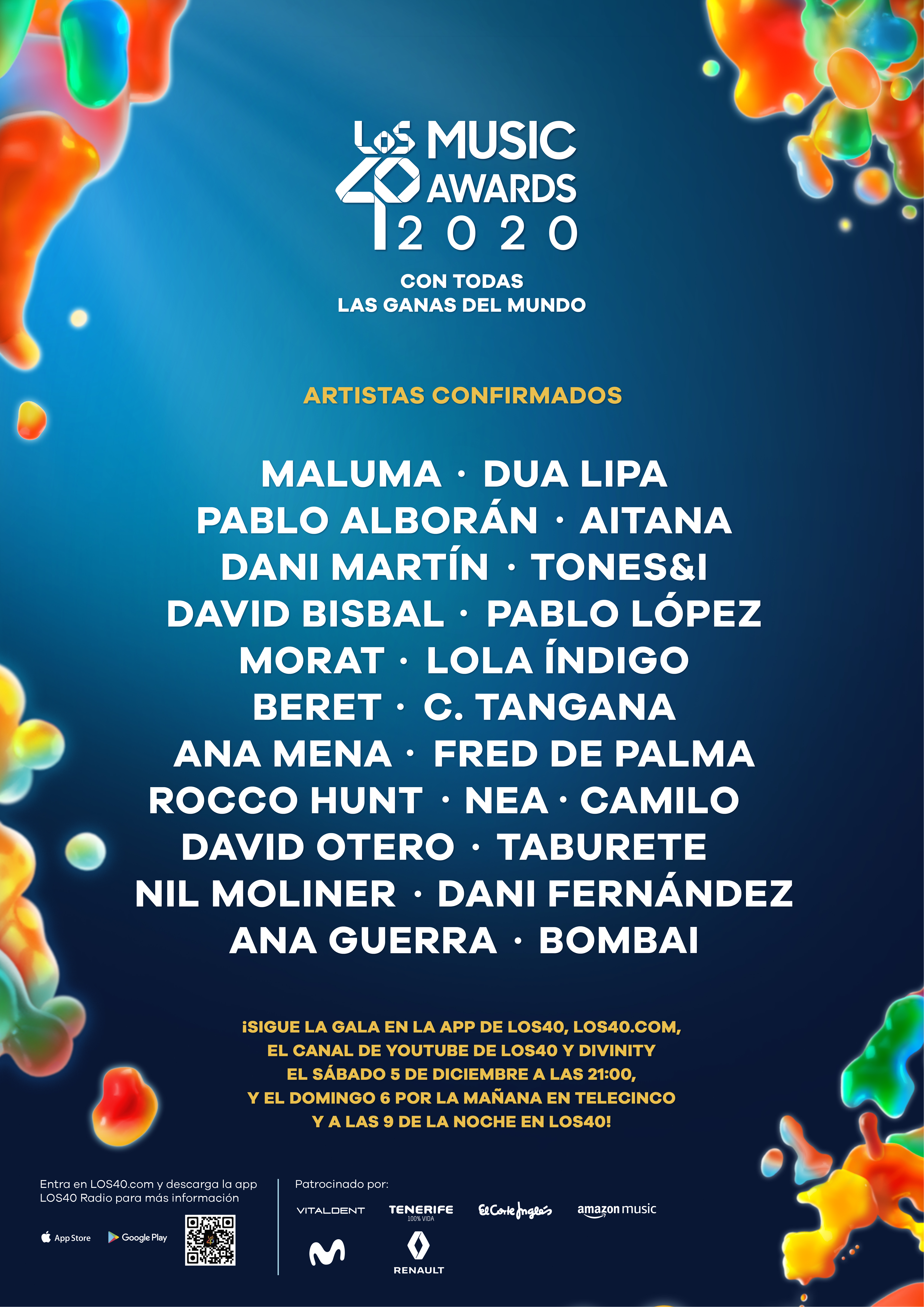 Para llenar por una noche todos los hogares españoles de la mejor música, LOS40 Music Awards 2020 contarán con Dua Lipa, Maluma, Pablo Alborán, Aitana y Dani Martín, que unirán sus voces a estrellas como David Bisbal, Ana Mena, Ana Guerra, Lola Índigo, David Otero, Pablo López, Taburete, Morat, Camilo, Beret, C. Tangana, Nea, Nil Moliner, Dani Fernández, Rocco Hunt, Fred de Palma, Bombai y Tones & I.